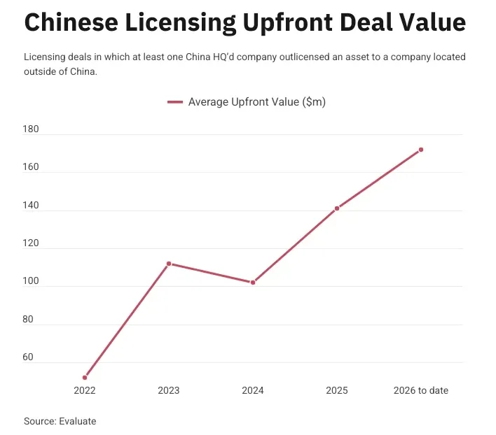 近期,Evaluate公布的核心数据显示,在西方生物制药企业与中国合作方之间的授权合作交易中,平均首付款金额从2022年的5200万美元飙升至2026年的1.72亿美元,涨幅达230%。中国早已不是全球生物制药领域的 “低价洼地”,这场由交易规模和价格双升驱动的产业变革,正重构全球生物科技的合作版图、竞争规则与价值判断。