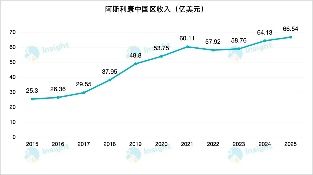 自从 2024 年超过默沙东,重新夺回中国区 TOP1 宝座后,阿斯利康在中国的业绩一路走高,2025 年达到了 66.64 亿美元,刷新历史记录。这些成绩主要得益于 Tagrisso(奥希替尼)、Farxiga(达格列净)等创新产品的驱动。