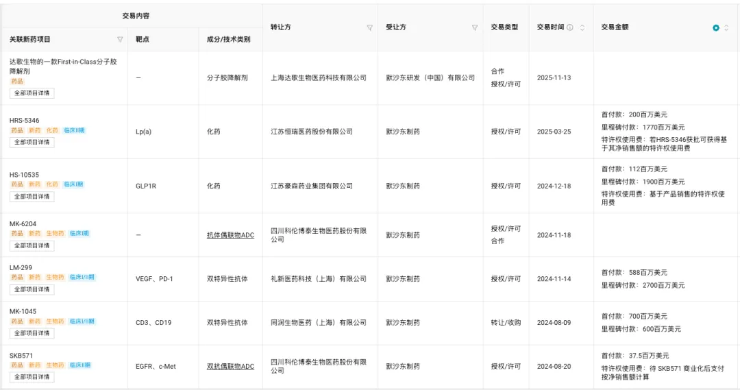 为了重回增长,默沙东近两年一直在加注创新管线,国内与其达成合作的药企有达歌生物、恒瑞医药、翰森制药、科伦博泰、礼新药业、同润生物等,涉及产品类型包括双抗、ADC、双抗 ADC、分子胶降解剂等。