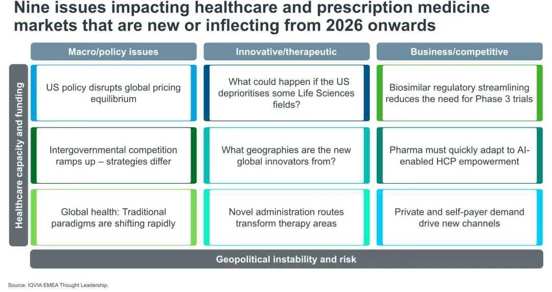 本文是IQVIA发布的Nine for 2026: Nine issues that are new or trend-breaking in 2026 for global Life Sciences and healthcare系列文章的第三篇,聚焦IQVIA对于影响处方药市场及全球医疗健康格局的重大趋势性议题的见解。此前的两篇文章2026全球生命科学与医疗健康领域九大创新趋势(一)和2026全球生命科学与医疗健康领域九大创新趋势(二)已分别探讨了宏观与政策层面的议题,以及正在重塑医疗格局的创新与治疗领域的新趋势。