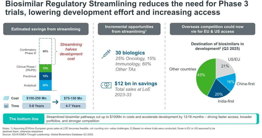 全球监管机构正在重写生物类似药的相关规则,这一时机尤为关键。随着行业迎来一波重磅生物制剂(尤其在肿瘤和免疫领域)专利到期,欧洲药品管理局(EMA)和美国食品药品监督管理局(FDA)正紧随英国药品和健康产品管理局(MHRA)的步伐,推出简化审批路径。新的框架将取消对确认性III期临床试验的要求,研发成本预计将减半,并可节省最高达1亿美元,上市周期缩短一年以上。