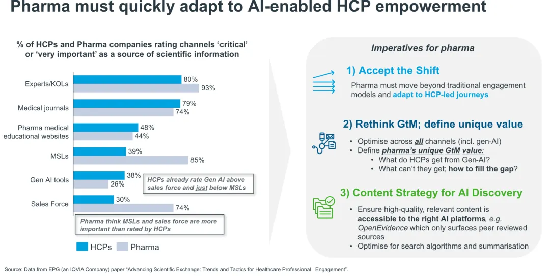 根据IQVIA旗下EPG近期开展的一项基于美国的调查,38%的医疗专业人士认为生成式人工智能工具是“关键”或“非常重要”的科学信息来源,这一比例已高于销售代表(30%),仅次于医学科学联络官(MSLs)的39%。这一变化凸显了医疗专业人士对AI驱动渠道获取信息的依赖程度正在日益加深。相比之下,制药公司仍然倾向于传统的互动模式,同时高估了销售代表和医学科学联络员(MSL)的重要性。下图所揭示的战略脱节表明,制药企业亟需重新校准沟通战略,调整并适应AI赋能的医疗专业人士,并聚焦于三大关键要务: