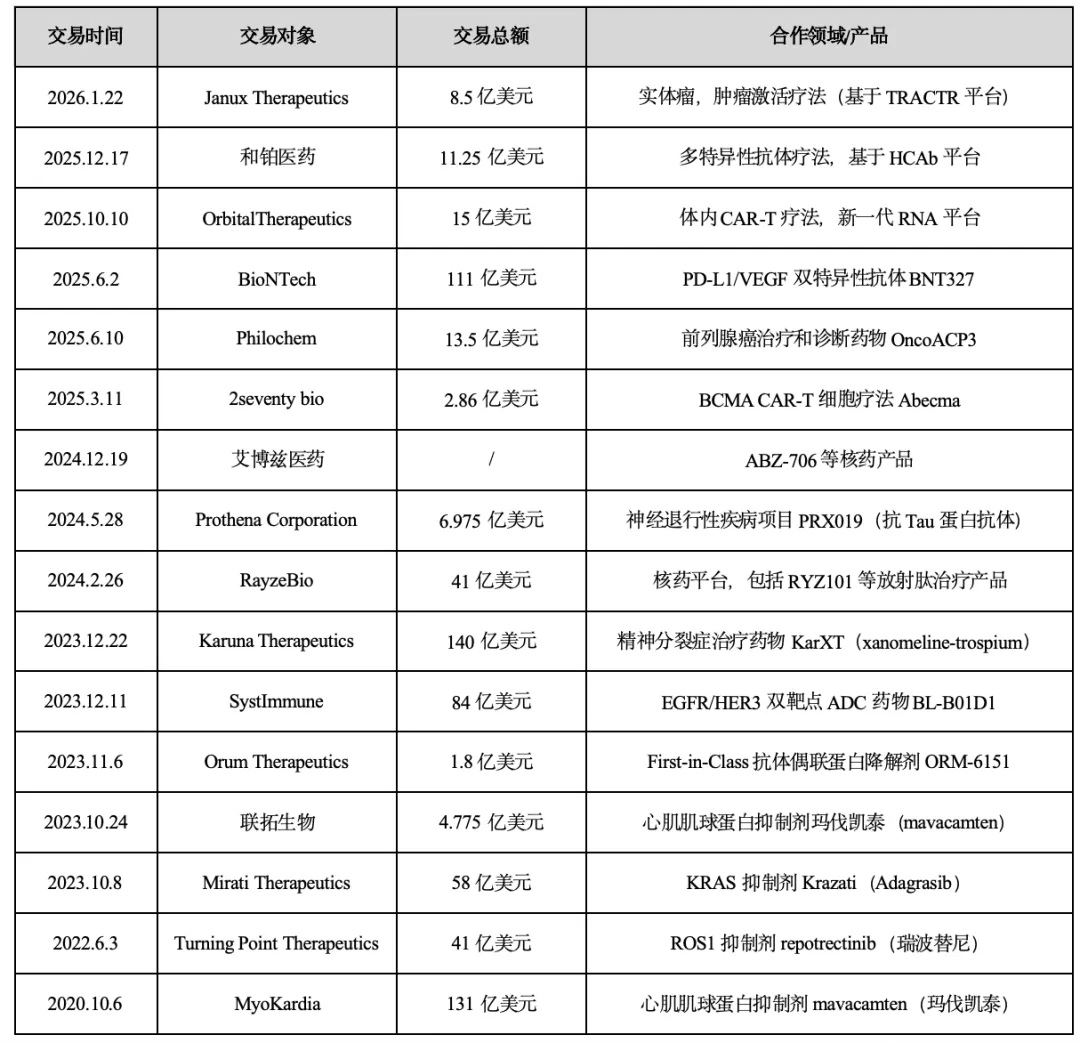 近年来,BMS还以“以量换时间”为策略,通过大量BD交易快速拓展管线并布局前沿技术,试图在新老产品交替的窗口期内快速构建新的增长引擎。2020年至2026年初,BMS累计达成16笔交易,总金额高达670亿美元,重点聚焦肿瘤精准治疗、神经科学和心血管三大领域,并积极介入多抗、蛋白降解剂等新兴平台(表1)。