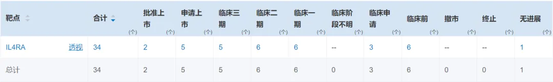 IL-4Rα赛道国内上市及在研药物数量,来源:药渡数据-全球药物库