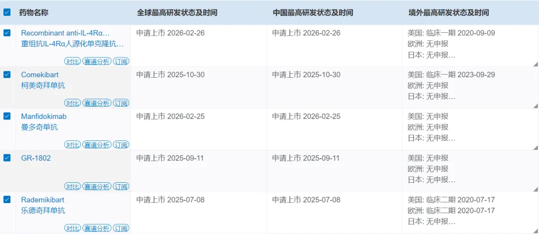 图4. IL-4Rα赛道国内已申报上市药物,来源:药渡数据-全球药物库