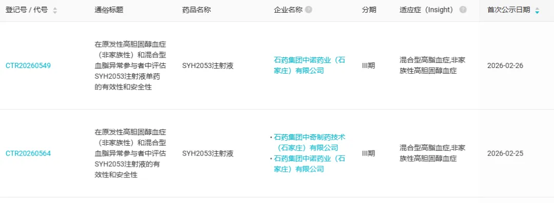 根据 Insight 数据库,石药集团于 2 月 25-26 日登记了两项 SYH2053 注射液的国内 Ⅲ 期临床(CTR20260564、CTR20260549),以评估 SYH2053 单药治疗原发性高胆固醇血症(非家族性)和混合型血脂异常受试者的有效性和安全性。