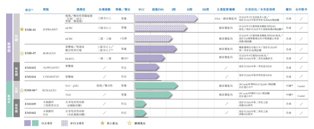 在研管线方面,岸迈生物已构建起覆盖肿瘤和自身免疫性疾病的TCE双抗管线,布局全面且具备差异化优势,目前拥有三款处于临床阶段、四款处于临床前阶段的候选药物。其中,核心产品EMB-01(EGFR/cMET双抗)以转移性结直肠癌为主要适应症,目前处于II期临床阶段;EMB-06(BCMA/CD3双抗)聚焦复发/难治性多发性骨髓瘤的治疗;EMB-07(ROR1/CD3双抗)则用于淋巴瘤及实体瘤的治疗。