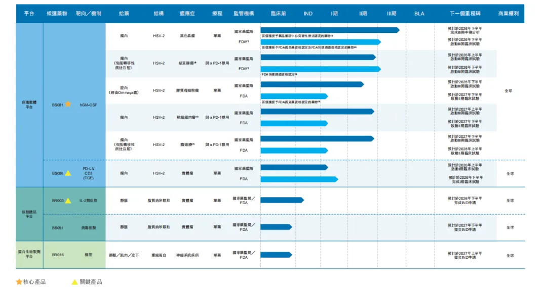 目前,公司正研究BS001作为单药疗法、以及作为核心药物参与的联合疗法,用于治疗多种实体瘤适应症,包括黑色素瘤、结直肠癌、胶质母细胞瘤、软组织肉瘤及胆道癌。该产品是全球首个进入临床III期关键试验、以HSV-2为病毒骨架的溶瘤病毒候选药物,有潜力成为全球首个获批准的以HSV-2为病毒骨架的溶瘤病毒疗法。