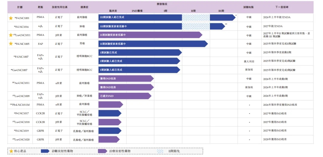 其中核心产品共3款,具体包括:一款处于注册阶段的PSMA靶向候选诊断放射性药物18F-LNC1001,专门开发用于PSMA阳性前列腺癌患者的正电子放射断层扫描(PET)影像诊断,其两项III期临床试验均已取得总结报告,证实具有较高的诊断准确性和良好的安全性;一款FAP靶向候选诊断放射性药物18F-LNC1005,专为FAP阳性实体肿瘤(如胃癌)患者的PET影像诊断而开发,目前处于II/III期联合试验阶段;以及一款PSMA靶向治疗放射性药物177Lu-LNC1011,专门用于治疗PSMA阳性转移性去势抵抗性前列腺癌(mCRPC),目前处于II期临床阶段。