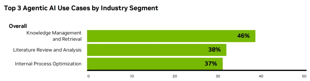 总体来看,46%的受访者表示,AI智能体的第一大应用场景是知识管理与检索,其次是文献综述与分析(38%)以及内部流程优化(37%)。