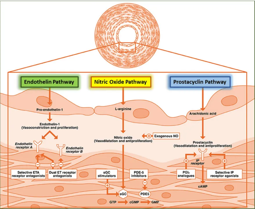 首先,一氧化氮(NO)通路功能受损。NO由血管内皮细胞产生,通过激活可溶性鸟苷酸环化酶(sGC)产生环磷酸鸟苷(cGMP),进而使血管平滑肌舒张。PAH患者体内NO生物利用度下降,导致血管收缩和细胞增殖。