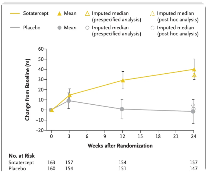 Sotatercept组:6MWD中位数增加34.4米,实际观察均值增加40.1米;