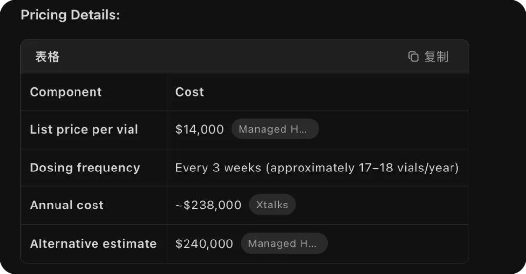 Sotatercept在上市后展现出强劲的商业化动能。2024年3月获FDA批准(商品名Winrevair),当年即实现4.19亿美元销售额;2025年上半年销售额达6.15亿美元,累计销售额已超13亿美元。行业分析师普遍上调峰值销售预期至50-60亿美元。具体计算上,美国患者基数:约4万名确诊患者(REVEAL登记研究数据,每百万成人约10.6例);目标人群:假设50%渗透率,即2万名患者;定价策略:年治疗费用约24万美元(皮下注射,每3周一次),属于罕见病生物药的高端定价区间。