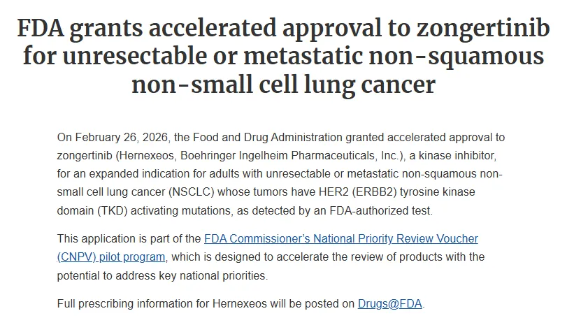 2月26日,FDA通过特批通道批准宗艾替尼(zongertinib)用于治疗存在HER2(ERBB2)酪氨酸激酶结构域激活突变的不可切除或转移性非鳞状非小细胞肺癌(NSCLC)成人患者。