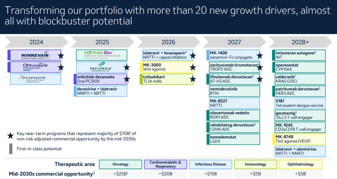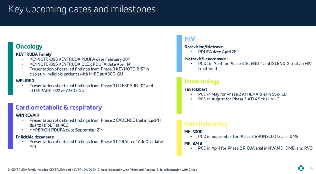 得益于较高的研发投入和强大的产品管线组合,默沙东表示非常有信心应对 Keytruda 即将到来的专利悬崖危机。根据今年一月份 JPM 大会上的报告,默沙东正在开展 80 项 III 期临床研究,新的增长动力带来的商业机会是预测的 2028 年 Keytruda 总销售额的两倍多。