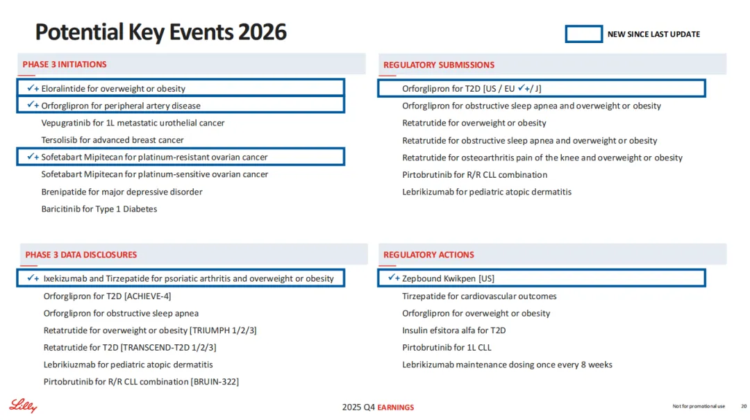 展望 2026 年,礼来表示,受正在进行和新启动的后期项目推动,其研发支出将继续加速增长,并将迎来众多里程碑进展(详见下图)。其中,礼来 2026 年有望取得多项监管获批进展,包括替尔泊肽获批治疗心血管结局、Orforglipron 获批治疗肥胖、Insulin efsitora alfa 获批治疗 2 型糖尿病、Pirtobrutinib 获批一线 CLL 等等。