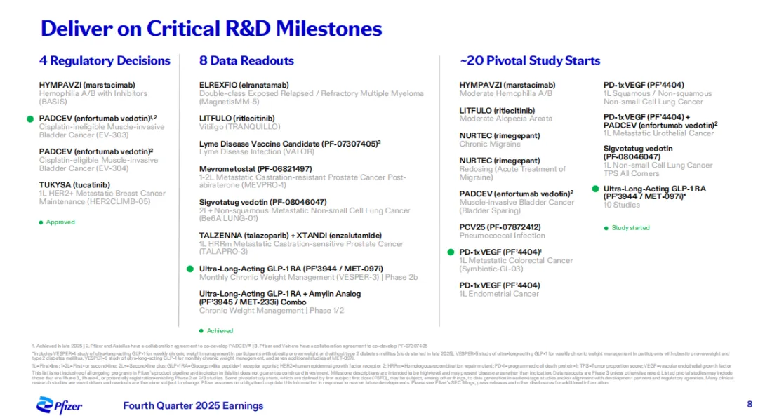 辉瑞 CEO 在财报中表示,对辉瑞而言,2026 年将是重要的一年。该公司今年将有诸多关键催化剂事件,包括计划启动约 20 项关键性临床研究,以及持续的战略投资,以最大限度地把握机遇,在这个十年末实现行业领先的增长。