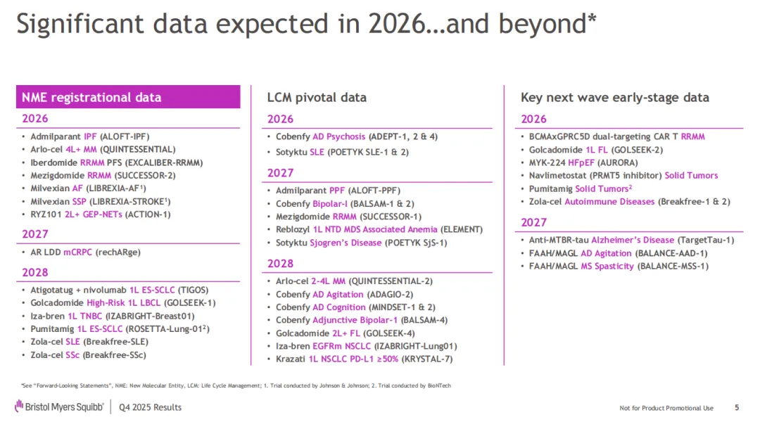 根据财报,BMS 产品管线现有 30+ Ⅰ 期临床项目、11 个 Ⅱ 期临床项目、18 个 Ⅲ 期临床项目、3 个注册阶段的项目。展望未来三年,BMS 有望迎来诸多预期里程碑进展。在 2026 年,BMS 预计将有 7 项注册行临床试验迎来数据读出,同时将披露 6 项早期临床试验数据。