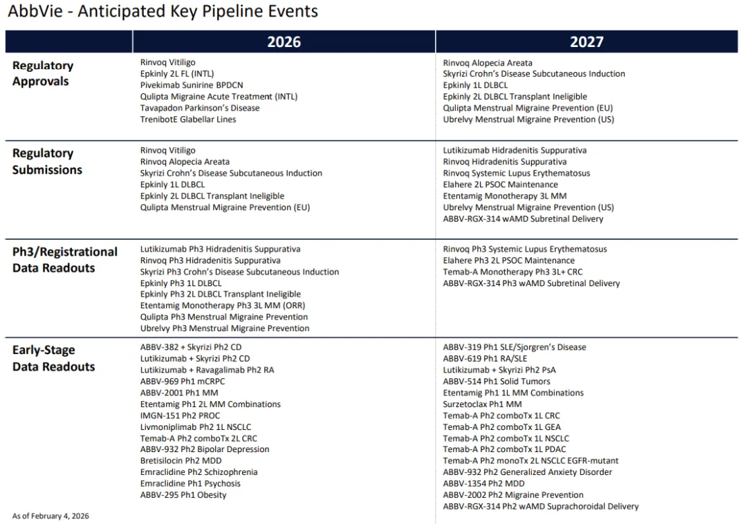2026 年,艾伯维有望迎来 6 个监管获批,包括: Rinvoq(乌帕替尼)获批治疗白癜风、Epkinly (艾可瑞妥单抗)获批二线治疗滤泡性淋巴瘤、Pivekimab Sunirine(IL3RA ADC)获批治疗母细胞性浆细胞样树突细胞肿瘤、Qulipta(阿托吉泮)获批治用于治疗急性偏头痛、Tavapadon 获批治疗帕金森病、TrenibotE 获批用于眉间纹。同时,其还将递交 6 个上市申请。