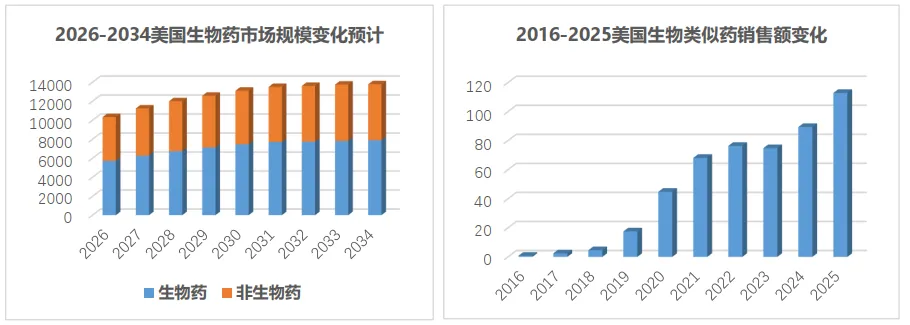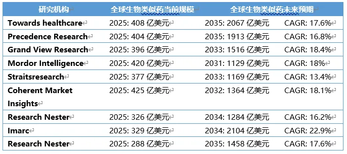 2025年全球生物药市场规模达到了7500亿美元,占到了全球整体医药市场的大约42%,突破万亿美元大关的时间预计进一步提前至2028年。在多个重磅原研药专利限制解除、全球监管政策持续优化、药企商业化策略更加成熟和临床接受度进一步提升等多重因素的共同推动下,以欧美为代表的全球生物类似药市场规模在过去一年中进一步扩大,从多家研究机构最新的预测来看,当前全球生物类似药整体规模在400亿美元左右,未来十年的预期复合增长率有望接近20%,将进一步延续此前快速增长的势头。