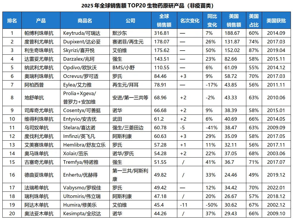 2025年全球销售额TOP100药品中,以单抗为代表的生物大分子药物数量占据了半壁江山,