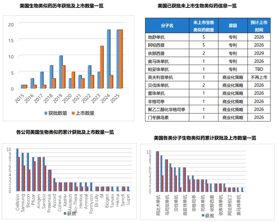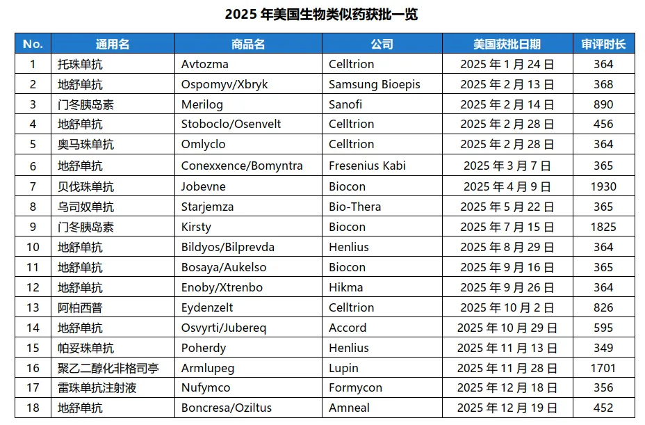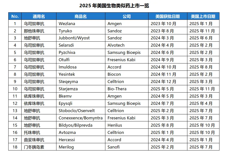 从上市情况看,2025年共有7个分子的18个生物类似药上市,打破了此前2023年13个产品上市的历史最高记录,