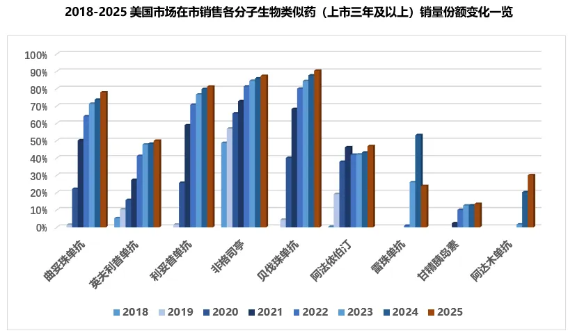 美国市场生物类似药在过去的一年里进一步渗透,2025年有生物类似药在售的分子共有17个,其中地舒单抗、乌司奴单抗、依库珠单抗、那他珠单抗和门冬胰岛素五个分子的生物类似药于2025年首次上市,其余12个分子的首个生物类似药上市时间截至去年底均在一年以上。除雷珠单抗外的其余分子对应的生物类似药产品市场销量份额相比上年均取得了不同程度的增长,部分老产品的增速已经明显放缓,渗透速度在不同的疾病领域也存在较为明显的差异。