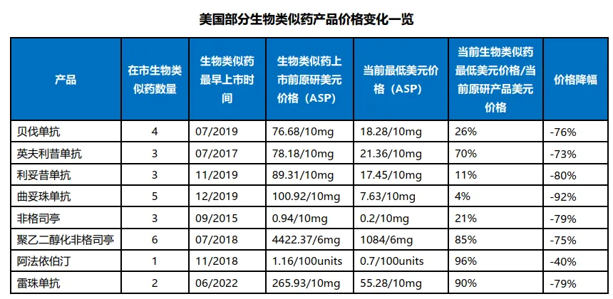 在价格方面,各家自身商业化销售策略的不同使得不同生物类似药产品价格有升有降。具体来看,Pfizer的曲妥珠单抗三仿产品Trazimera的降幅达到了79%,成为了过去一年里降幅最大的生物类似药单品,目前该产品份额排名第三,仅次于首仿产品Kanjinti和二仿产品Ogivri。与当前各分子原研产品价格相比,曲妥珠单抗的当前最低生物类似药ASP价格(平均销售价格)达到了最低的4%,阿法依泊汀当前唯一的生物类似药ASP价格(平均销售价格)则达到了最高的96%,8个分子当前最低生物类似药产品ASP价格相比于生物类似药上市之前的原研品价格降幅在40%-92%之间,6个产品的降幅超过了75%,其中曲妥珠单抗的价格降幅最大,阿法依泊汀的价格降幅最小。