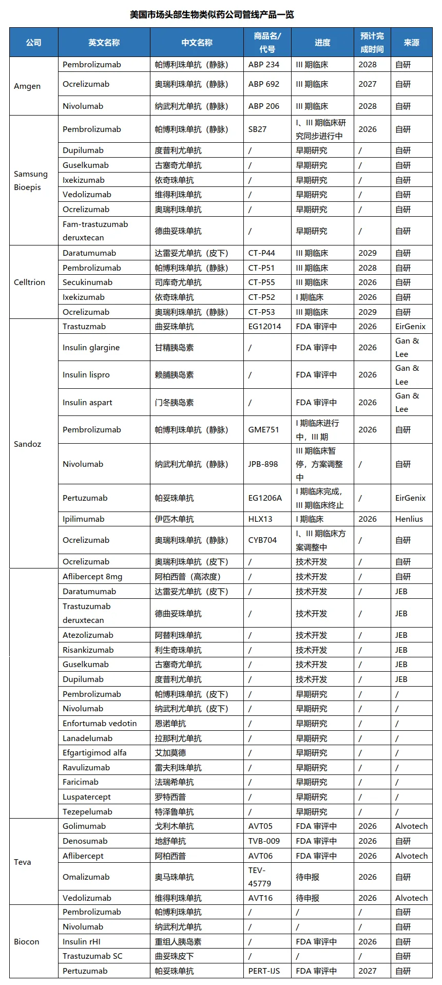 印度军团集体涌入成为过去一年中的另一看点,作为领军先驱的Accord在2025年初成功上市了其在美国市场的首个产品曲妥珠单抗生物类似药Hercessi,随后又于4月份完成了对Coherus聚乙二醇化非格司亭的全模块收购,快速切入成熟高份额赛道,8月份作为七仿上市了乌司奴单抗生物类似药Imuldosa,进一步补充了商业化产品管线,其于去年10月获批的另一产品地舒单抗生物类似药(Osvyrti/Jubereq)预计将于今年登陆美国市场。今年1月,其于2014年申报的非格司亭生物类似药Filkri历时11年最终获批,为这段难忘的历史画上了圆满的句号,Accord计划通过自研和外部引进截至2030年累计在美上市生物类似药产品数量达到30个;此前一直没有进入生物类似药领域的老大哥Sun在今年1月报价计划以100亿美元组团收购Organon,借此快速进入美国生物类似药领域,最终成交价格有可能达到140亿美元;在十年前计划进入但又最终放弃进入美国生物类似药市场的Cipla华丽归来,于去年6月与中国台湾公司Tanvex就其非格司亭生物类似药Nypozi达成商业化销售授权合作,计划于今年二季度在美上市该产品,后续还将通过外部引进和自研的方式进一步扩充产品线,力争于2029-2030年左右在美上市首个自研生物类似药产品;DRL有望在2026年下半年迎来其首个生物类似药地舒单抗的在美上市,其合作伙伴Alvotech生产场地的GMP问题在一定程度上影响了该产品的原计划非获批时间,另一生物类似药产品阿巴西普已于去年底完成申报,有望最快于今年底获批上市;Zydus于去年12月与Formycon相继就帕博利珠单抗和雷珠单抗生物类似药达成美国市场商业化销售合作,其刚刚于今年1月在印度上市了全球首个纳武利尤单抗生物类似药;Lupin则采取对外授权的方式实现入市,其于去年12月与美国本土销售公司Valorum就其聚乙二醇化非格司亭生物类似药Armlupeg达成了授权合作。