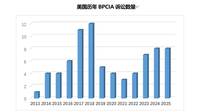 BPCIA诉讼大战在2025年迎来了第13个年头, 2025年8起新诉讼案件数量与上年持平,并列7年来最高。截至2025年底,美国历史累计BPCIA诉讼数量已经达到了77起,其中包括了一些双方针对同一产品在不同地区或针对不同专利发起的同源性诉讼。