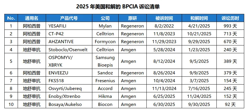 过去的2025年里共有10起诉讼落下帷幕,均已和解告终,涉及地舒单抗和阿柏西普两大重磅分子。其中最早的一起于2022年发起,历时近1000天,最快的一起仅用时92天,基本趋势还是越早被诉的耗时越长,但获得的和解条件相对来说也更好。10起诉讼的原告方共涉及Amgen和Regeneron两家公司,被诉方涉及Sandoz等9家公司。