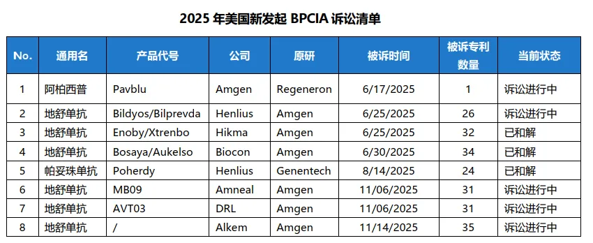 2025年新发起的8起诉讼共涉及地舒单抗、阿柏西普和帕妥珠单抗三个分子,其中包括了Regeneron对Amgen发起的针对同一产品的第二起诉讼,其中涉及地舒单抗的两起在同年即完成和解,剩余8起仍在诉讼中。除去前述针对Amgen的第二起诉讼涉及专利数量降低为1个之外,剩余7起诉讼的平均被诉侵权专利数量为30个,最多的为35个,最少的为24个。8起诉讼的原告方共涉及Amgen、Regeneron和Genentech三家公司,被诉方涉及Hikma等7家公司。