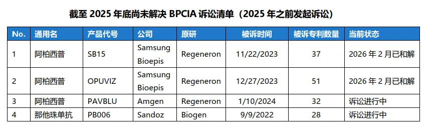 截至2025年底,在2025年之前发起的诉讼仍有4起尚未解决,其中3起涉及阿柏西普,另一起涉及那他珠单抗,Sandoz已于去年底在诉讼尚未解决的情况下冒险上市了该产品。4起诉讼的平均被诉侵权专利数量为37个,最多的为51个,最少的为28个。4起诉讼的原告方共涉及Regeneron和Biogen两家公司,被诉方涉及Sandoz等3家公司。