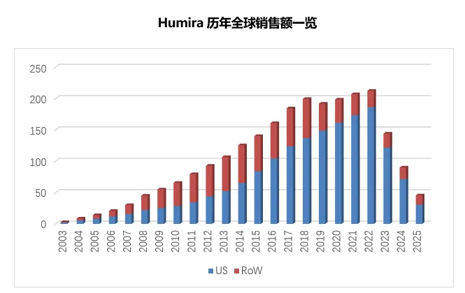 作为目前美国市场竞争最为激烈的产品,阿达木单抗生物类似药在过去一年中加速渗透,原研产品Humira在美国市场进一步崩盘的不利形势下其2025年全球销售额如去年预测跌破50亿美元,最终交出了45.4亿美元的答卷,大跌50%。