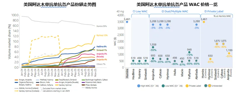 截至2025年12月,生物类似药的整体份额已提升至41%,相比一年前提升了10%,分别与CVS和Express Scripts两大PBM合作、采用双定价策略的Sandoz和Amgen继续领跑生物类似药的份额榜,两家的产品也分别是二仿和首仿的阿达木单抗生物类似药,采用低价策略的Organon和Teva紧随其后,份额均在7%左右。随着 MedImpact 等独立 PBM 推动 “低 WAC + 无返点”的新模式,以及Prestige等其他潜在竞争者在未来的进入,阿达木单抗后续的市场竞争将更加激烈,价格体系和渠道格局有望迎来进一步重塑。
