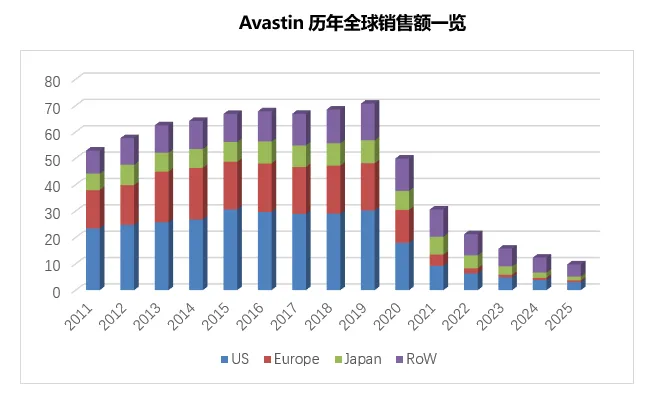 2025年贝伐珠单抗原研产品Avastin在全球生物类似药持续冲击的影响下其欧、美、日和其他市场四大区域销售收入进一步下滑,除日本市场降幅低于上年外,其余三大区域的下滑速度均超过了2024年,最终全球收入进一步下滑至9.73亿瑞士法郎(约合11.7亿美元),整体降幅达到了21%(以恒定汇率计为17%),与上年基本持平。