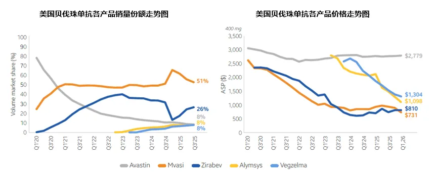 2025年,原研产品Avastin美国市场销售收入为2.99亿瑞士法郎(约合3.6亿美元),相比上年下滑了22%,美国市场在全球收入中的区域占比继续维持在31%左右。美国市场贝伐珠单抗的2025年整体销量小幅下滑至241万支(-3%),其中生物类似药占比达到了历史最高的90%,目前共有4家生物类似药产品在市销售。Amgen的贝伐珠单抗首仿生物类似药Mvasi以53%的全年平均份额蝉联销量榜冠军,美国市场5.73亿美元的销售额相比上年增长了28%,全球总收入达到了7.71亿美元(+6%),从其年报披露来看全球销售额的增长主要来自于销售扣减估算的有利调整和其净价的提升,并非来自于销量的扩张,“纸面增长”存在一定的水分;Pfizer的二仿产品Zirabev继续位列次席,全年平均份额由上年的27%降至22%(自2024年起Pfizer将全部抗肿瘤生物类似药收入进行合并报告,不再公布单一生物类似药产品收入,Zirabev的2023年美国市场收入为3.04亿美元);Amneal和Celltrion分别于2022年和2023年上市的生物类似药Alymsys和Vegzelma份额相比上年分别提升了近2个和4个百分点,继续位列三四位,彼此之间的差距进一步减小。从规格看,100mg/4ml产品的销量份额维持在53%左右,相比400mg/16ml的大规格产品略占优势;在价格方面,Vegzelma和Alymsys相比上年大幅下降,降幅分别达到了48%和30%,Mvasi美国市场价格相比一年前也出现了20%的降幅,原研产品Avastin的价格依旧稳定。当前最低平均销售价格(来自Mvasi)为18.28美元/10mg(-20%),相当于原研品价格的26%,原研产品Avastin的价格小幅增长至69.5美元/10mg(0.6%)。