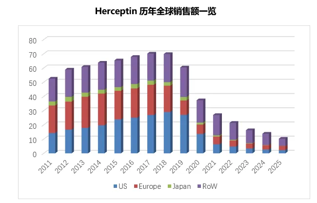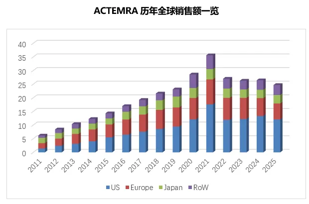 托珠单抗上市以来全球销售额持续增长并于2021年达到35.62亿瑞士法郎(约合44.4亿美元)的销售峰值,随后受2022疫情和2023欧洲托珠单抗生物类似药上市影响开始出现下滑。2025年其全球销售收入下滑至24.75亿瑞士法郎(约合29.8亿美元),相比上年下降了约7%。