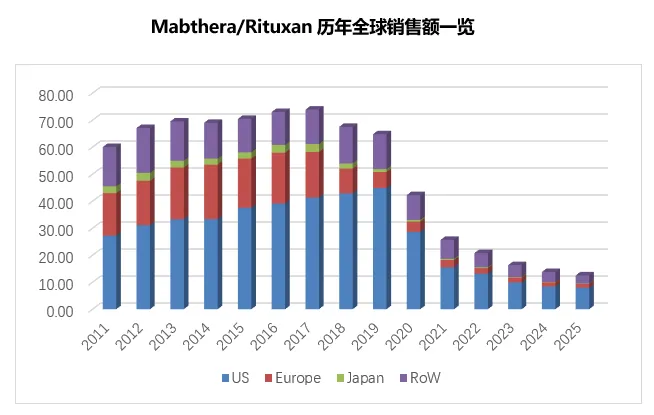 利妥昔单抗原研产品Mabthera/Rituxan (分别用于欧洲和美国市场)在2025年紧随Avastin和Herceptin两兄弟的步伐同步下滑,全球销售额降至12.51亿瑞士法郎(约合15.1亿美元),降幅达到了9.3%(以恒定汇率计为4%),此前大幅下降的速度有所缓解。