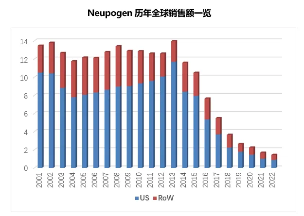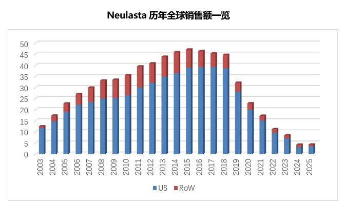 限于销售额过小已于2023年开始不在Amgen年报中单独报告销售收入的非格司亭原研品Neupogen,在2025年与该分类中包括4个生物类似药在内的另外13个产品一起取得了13.11亿美元的全球销售额,从趋势看Neupogen全球销售额已跌破一亿美元,在众多已有生物类似药上市的原研产品中表现最为惨淡。