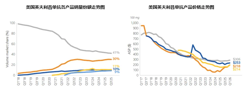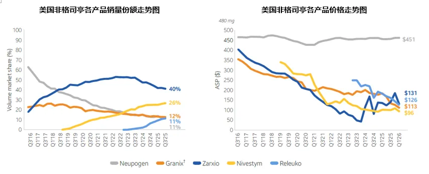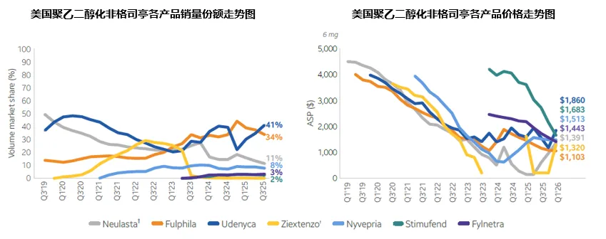 的处方目录中被调整为非首选,甚至被直接移除替换为生物类似药,销量近一步受到冲击。占据另外73%份额的预充注射器产品之争在原研公司Amgen与Coherus等6家生物类似药公司之间展开,单以预充式产品销量计算,Coherus的二仿产品Udenyca和Biocon在售的首仿产品Fulfila的全年份额分别达到了38%和35%,Amgen的原研产品份额仅剩12%,Pfizer的四仿产品Nyvepria以8%的份额排名第四,Sandoz的三仿产品Ziextenzo以及Fresenius和Amneal于2023年新上市的Stimufend和Fylnetra三个生物类似药的份额均未超过5%,其中Sandoz主要是基于商业化策略考量,在该产品价格战背景下盈利有限的情况下暂停了销售,将资源转向高增长的其他生物类似药,待2026年根据市场变化重新进行评估。将预充注射器、注射笔和自动注射器三种形式产品的销量合并计算,2025年该产品生物类似药的整体份额已经增长至65%。在价格方面,在整体趋势继续下滑的情况下,此前价格战中的极端低价已经不见,各家价格相对比较理性。原研产品Neulasta最新平均销售价格为1277美元/支,为当前市场第二低价,与一年前的极端低价相比大幅增长,Fresenius的Stimufend同比降幅最大,达到了53%,当前生物类似药最低平均销售价格(来自首仿产品Fulfila)为1084美元/支,相当于Neulasta价格的85%。