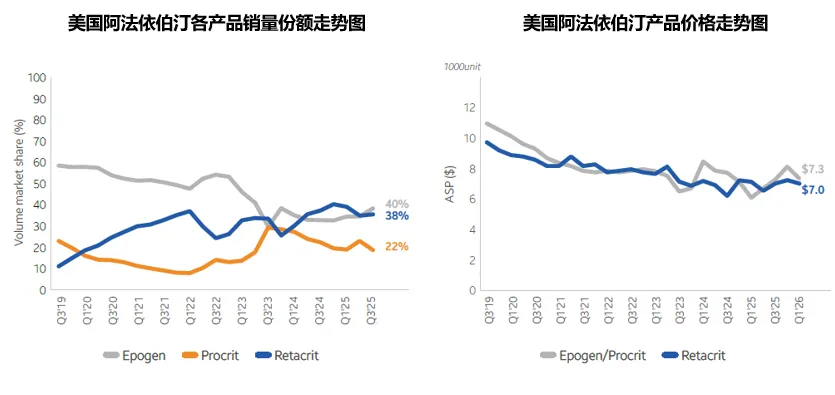 自Pfizer的生物类似药Retacrit于2018年底上市以来,一直未有新的生物类似药获批,2025年该产品的美国市场整体销量小幅增长至703万支(+4%),Retacrit的全年市场份额小幅提升到了47%,Pfizer年报自2024年起不再单独报告其收入,其当前平均销售价格为0.7美元/100units,与上年基本持平,相当于原研价格的96%,原研产品价格出现了20%的涨幅,当前平均销售价格0.73美元/100units。