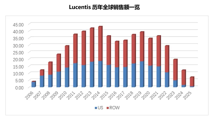 原研产品Lucentis在同领域其他创新药竞品及生物类似药的激烈竞争下不断萎缩,2025年的全球销售额最终以41%的历史最大跌幅定格在7.13亿美元,负责美国市场销售的Roche和美国外其他市场销售的Novartis分别贡献了其中的10%和90%。