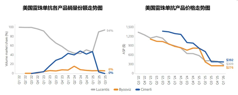 epis将该产品重新授权给Harrow,计划2026年重新推出该产品,两个生物类似药的各自变故共同导致了2025年生物类似药市场份额在非正常因素下的大幅下滑。在价格方面,原研产品Lucentis和两个生物类似药产品的价格均发生了大幅的下滑,其中Byooviz和Cimerli的最新的平均销售价格已分别降至55.28美元/0.1mg(-67%)和78.4美元/0.1mg(-54%),原研产品Lucentisi的最新的平均销售价格为61.74美元/0.1mg(-47%),相比生物类似药上市之前的自身价格已经下降了79%