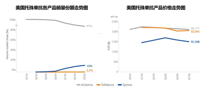 2025年,原研产品Actemra美国市场销售收入为12.06亿瑞士法郎(约合14.5亿美元),受生物类似药竞争影响,相比2024年下降了9%,占到了原研产品全球销售额的49%。2025年该产品的整体美国市场销量为207万支(+16%),保持持续增长状态,约51%的份额来自于162mg/0.9ml的皮下注射产品,其余来自于三个规格的静脉注射产品,静脉注射产品包装为西林瓶,皮下注射产品包装为预充式注射器和注射笔。随着Celltrion的Avtozma于去年10月的上市,目前共有三家生物类似药在售,其余两家为Organon的Tofidence以及Fresenius的Tyenne,前者来自于去年4月Biogen的转让。2025年生物类似药整体占比约为13%,几乎全部来自于Fresenius的首仿产品Tyenne,剩余两家的份额均不足1%。目前Fresenius已经上市了静脉和皮下两个版本的生物类似药,Tofidence仅有静脉产品获批,Celltrion首先上市了静脉产品,皮下产品将在稍后的授权日期之后推出。当前最低平均销售价格(来自Tyenne)为3.8美元/1mg(-8%),相当于原研品价格的71%。
