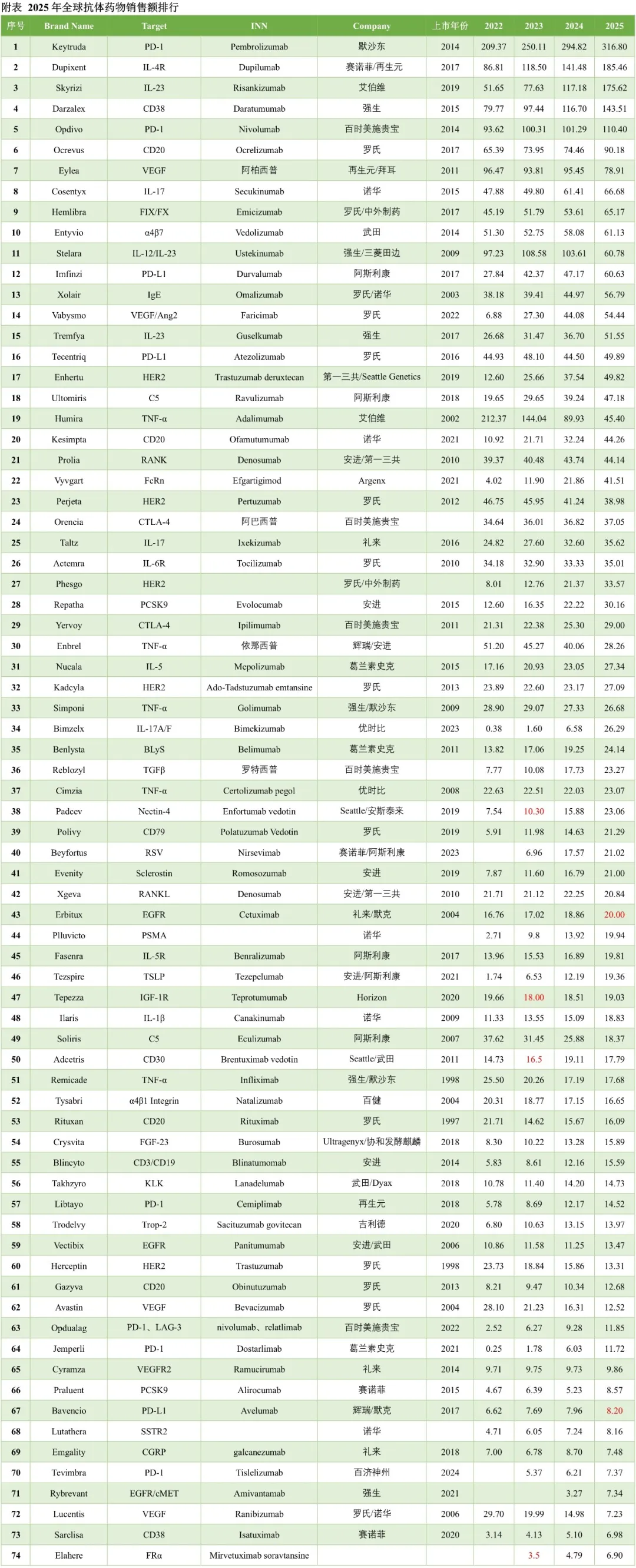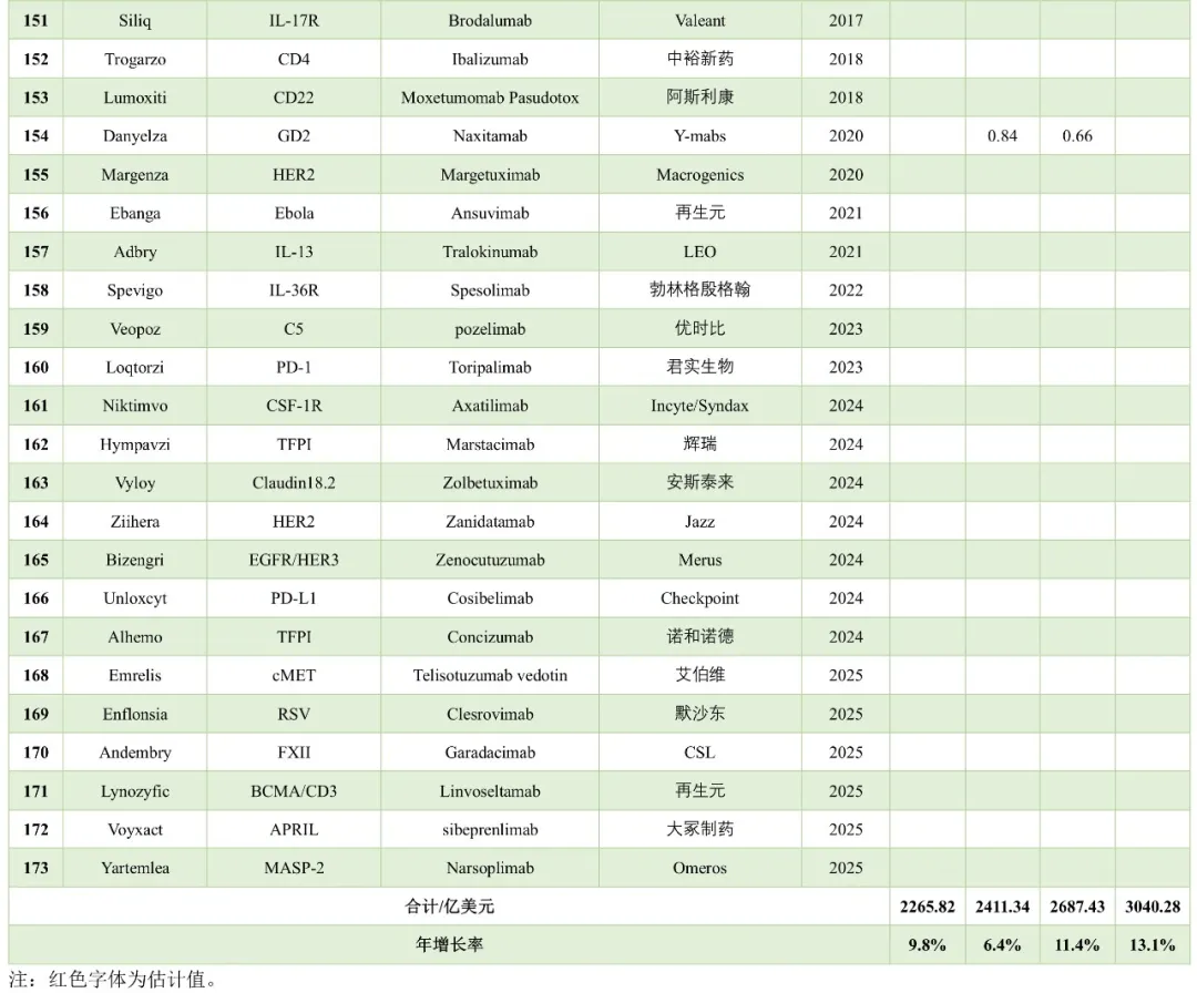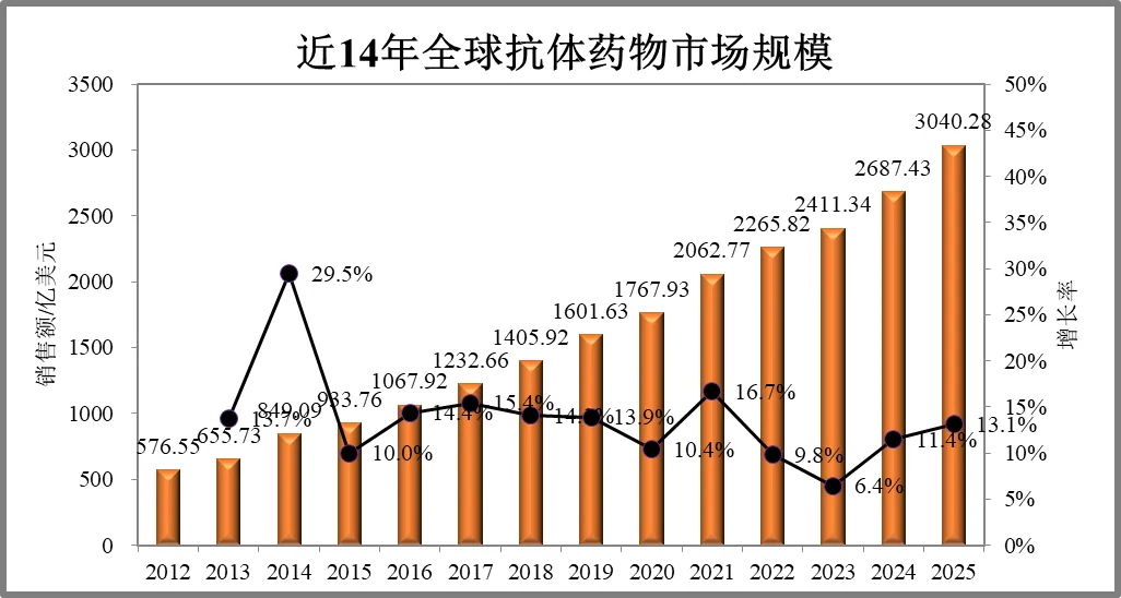 2025年全球抗体新药市场规模达到3040亿美元,相比2024年增长13%,5款抗体销售额超100亿美元,其中Keytruda超过300亿美元。10款抗体销售额在50-100亿美元,28款抗体销售额在20-50亿美元,21款抗体销售额在10-20亿美元。合计有64款抗体为重磅炸弹级别。