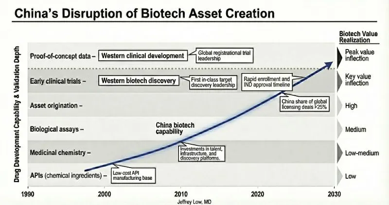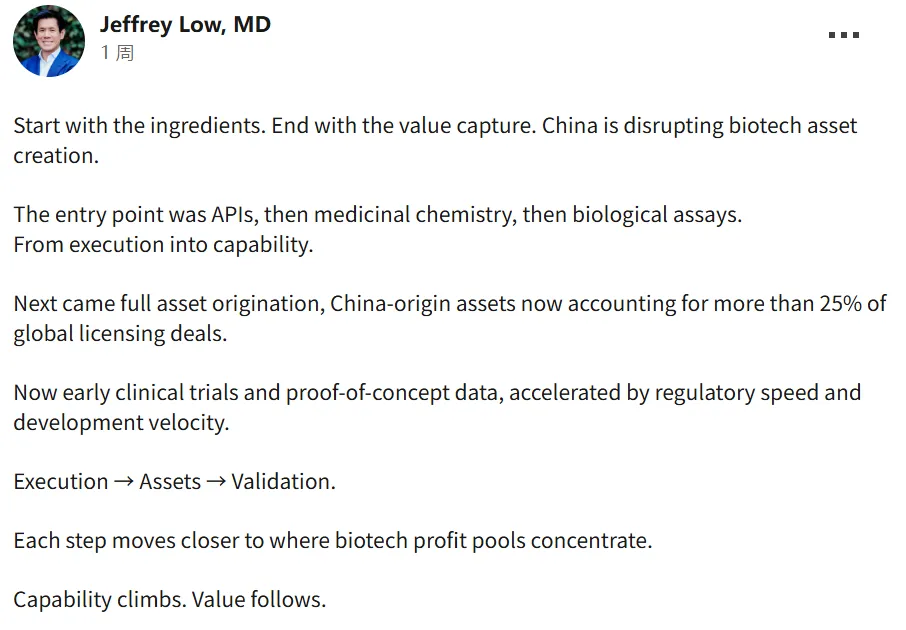 近日,他在领英上发出这样的判断:从原料药到临床试验,中国生物科技正在崛起。在他看来,中国创新药已经完成了从“追随者”到“贡献者”的身份转变,正站在从“数量积累”迈向“质量跃迁”的价值拐点之上。每一步,都在朝着生物技术利润池最集中的区域迈进;能力的攀升,终将带来价值的回归。