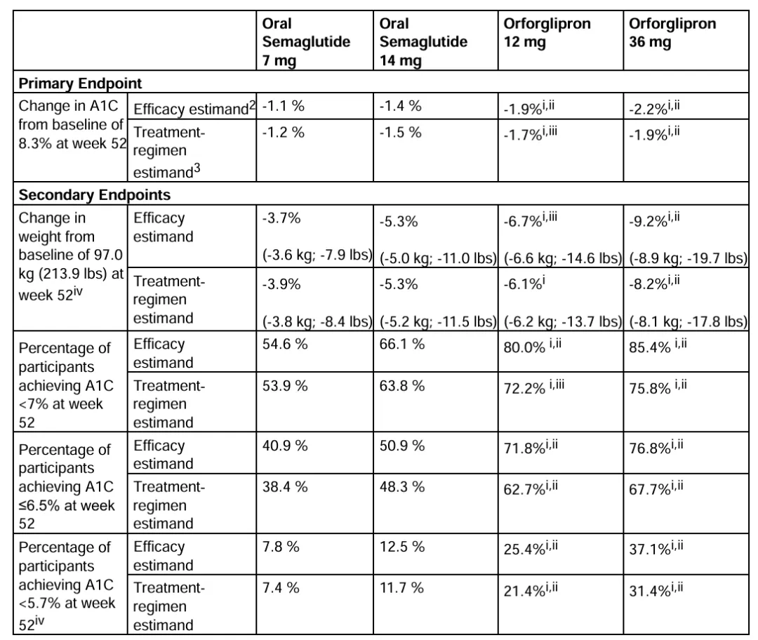 2月26日,礼来公司公布了orforglipron头对头III期试验ACHIEVE-3研究数据。该研究纳入了1698名经二甲双胍治疗血糖控制不佳的2型糖尿病成人患者,结果显示,orforglipron在降糖和减重方面均显著优于诺和诺德的口服司美格鲁肽Rybelsus,在降低糖化血红蛋白和体重改善方面实现全面胜出。