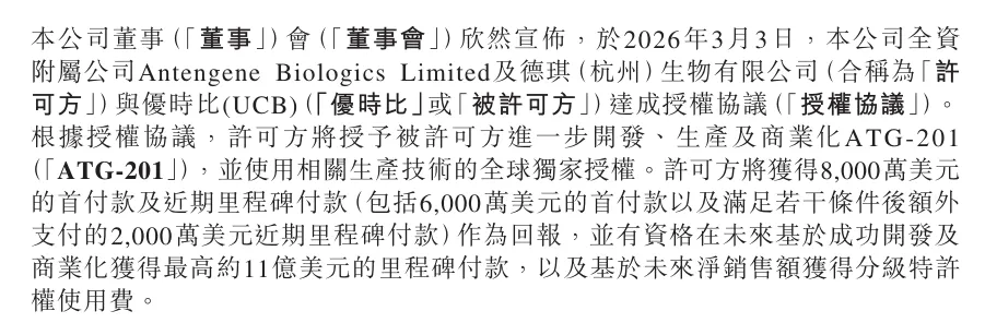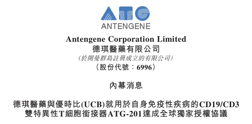 3月4日,德琪医药发布公告宣布,与优时比(UCB)达成授权协议。根据授权协议,德琪医药授予优时比进一步开发、生产及商业化ATG-201,并使用相关生产技术的全球独家授权。