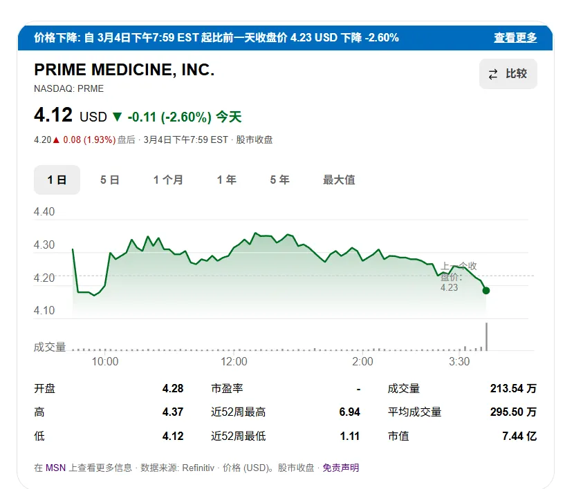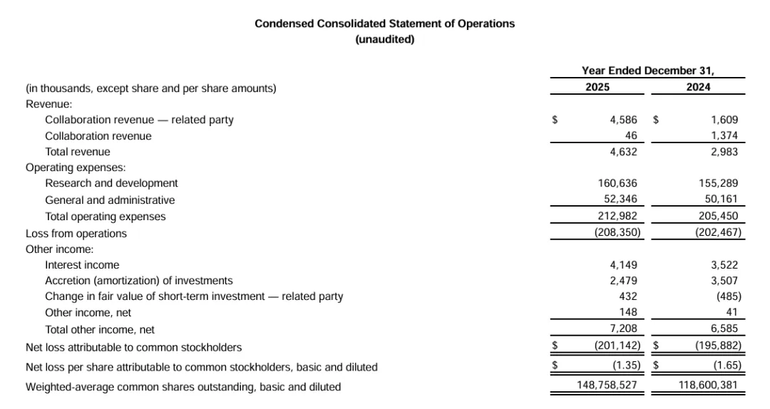 3月5日,主打Prime Editor(先导编辑) 一次性治愈型基因疗法的公司Prime Medicine, Inc.(NASDAQ: PRME)公布2025年业绩,2025年总营收463.2万美元,同比增长55%,研发费用1.06亿美元,同比增长3.4%,增长的原因是许可 / IP 成本、设施费用增加,净亏损2亿美元,现金及现金等价物1.91亿美元。